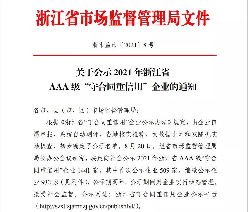 近日,浙江省市場監管局向社會公示1141家企業為2021年浙江省AAA級“守合同重信用”企業,其中首次公示企業509家,繼續公示企業932家。龍元集團繼續獲評省AAA級“守合同重信用”企業,這是集團多年來一直堅持守合同重信用工作、以誠信推動企業發展的結果。