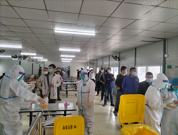 4月28日下午,項目部召集管理人員,召回現(xiàn)場工人,迅速組織開展全員核酸檢測工作。信息核對、樣本采集、樣品分裝等各個環(huán)節(jié)忙而不亂,急而有序,項目管理人員全部出動,2個半小時配合醫(yī)護人員完成項目部全員1220人核酸采樣工作。