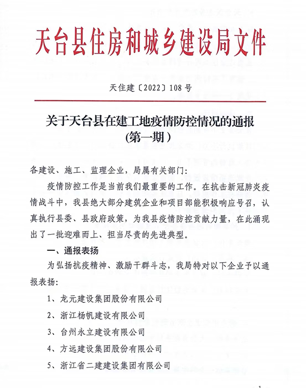 5月1日勞動節(jié),項目部收到了來自天臺縣住建局的通報表揚:“表揚龍元建設(shè)能在戰(zhàn)“疫”危急時刻,主動馳援,充分發(fā)揮企業(yè)優(yōu)勢,積極履行縣里政策要求,對縣內(nèi)封控區(qū)周邊全區(qū)域進行硬隔離防護工作,用自己的方式支援疫情防控,譜寫了新時代企業(yè)的社會責(zé)任與擔(dān)當,為天臺縣抗擊疫情防控筑起了一道堅實屏障。”